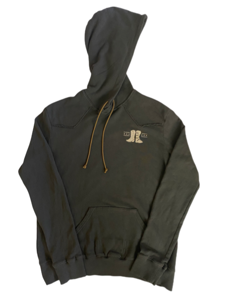 Check out this Western-Style Hoody that is made for comfort and adventure featuring a rugged paracord drawstring, a cozy kangaroo pocket with a hidden stash pocket, sharp western-style seam lines and a bold cowgirl boot logo. Designed for riding, ranching or just relaxing in style. It has a relaxed fit for comfort. 100 % cotton, distressed garment dyed (may have variations of shading and color which are intended), lined hood, wash cold gentle cycle with like colors, air dry or low heat.